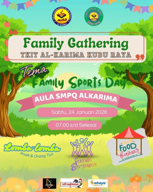 Kubu Raya — TKIT Al-Karima Kubu Raya akan menyelenggarakan kegiatan Family Gathering dengan mengusung tema “Family Sports Day” pada Sabtu, 24 Januari 2026. Kegiatan ini akan dilaksanakan di Aula SMPQ Alkarima, dimulai pukul 07.00 WIB hingga selesai.