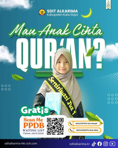 Kubu Raya – SDIT Alkarima Kabupaten Kubu Raya resmi membuka Waiting List Penerimaan Peserta Didik Baru (PPDB) Tahun Ajaran 2027/2028. Program ini diperuntukkan bagi orang tua yang ingin mempersiapkan pendidikan terbaik sejak dini dengan menjadikan Al-Qur’an sebagai fondasi utama pembentukan karakter anak.