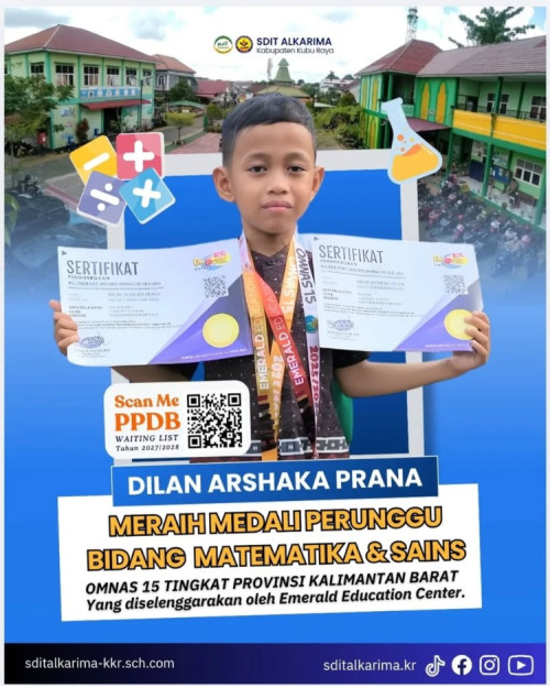 Kubu Raya, Kalimantan Barat — Prestasi membanggakan kembali ditorehkan oleh keluarga besar SDIT Alkarima Kabupaten Kubu Raya. Salah satu siswa terbaiknya, Dilan Arshaka Prana, berhasil meraih Medali Perunggu pada ajang Olimpiade Matematika dan Sains (OMNAS) ke-15 tingkat Provinsi Kalimantan Barat yang diselenggarakan oleh Emerald Education Center.