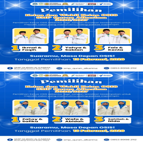Pemilihan Ketua dan Wakil Ketua OSIS SMP Quran Alkarima Periode 2026/2027 bukan sekadar agenda organisasi, tetapi merupakan bagian dari proses besar pembentukan generasi pemimpin Qur’ani yang siap membangun masa depan umat dan bangsa.
