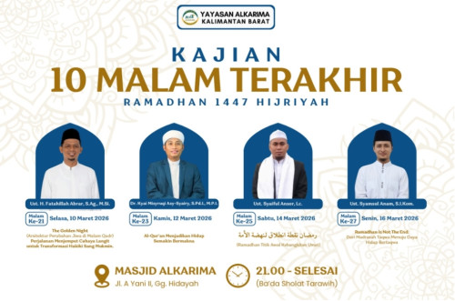 Kubu Raya — Dalam rangka menghidupkan malam-malam penuh kemuliaan di penghujung bulan suci Ramadhan, Yayasan Alkarima Kalimantan Barat menyelenggarakan Kajian 10 Malam Terakhir Ramadhan 1447 Hijriyah yang akan dilaksanakan di Masjid Alkarima.