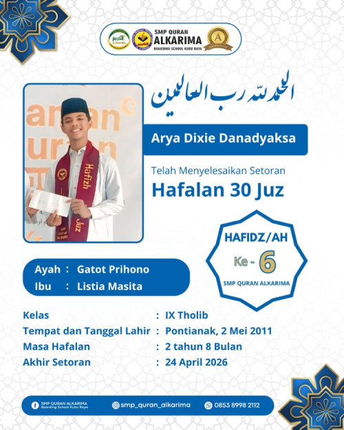 Keberhasilan Arya menjadikannya sebagai Hafidz ke-6 di SMP Quran Alkarima, sebuah capaian yang tidak hanya membanggakan secara pribadi, namun juga menjadi inspirasi bagi seluruh santri lainnya.
