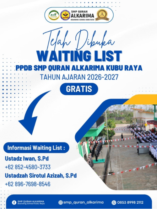 Kubu Raya, September 2025 – Yayasan Alkarima Kalimantan Barat dengan resmi mengumumkan dibukanya waiting list Penerimaan Peserta Didik Baru (PPDB) SMP Quran Alkarima Boarding School Kubu Raya untuk Tahun Ajaran 2026/2027.