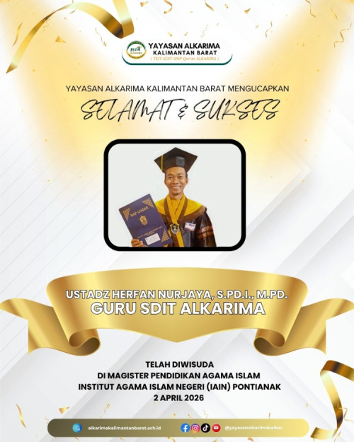 Pontianak, 2 April 2026 — Yayasan Alkarima Kalimantan Barat menyampaikan apresiasi dan ucapan selamat kepada salah satu tenaga pendidiknya, Ustadz Herfan Nurjaya, S.Pd.I., M.Pd., atas keberhasilannya menyelesaikan studi pada Program Magister Pendidikan Agama Islam di Institut Agama Islam Negeri (IAIN) Pontianak.