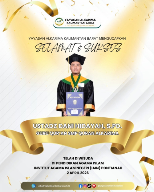 Kubu Raya — Yayasan Alkarima Kalimantan Barat kembali berbahagia atas capaian salah satu tenaga pendidiknya. Ustadz Dani Hidayah, S.Pd., yang merupakan Guru Qur’an di SMP Qur’an Alkarima, resmi diwisuda pada program Pendidikan Agama Islam di Institut Agama Islam Negeri (IAIN) Pontianak pada tanggal 2 April 2026.