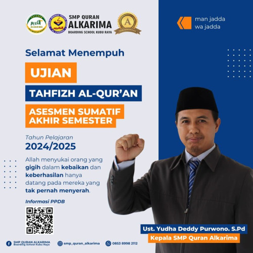 Semangat untuk semua siswa-siswi SMP Quran Alkarima! Jadikan ujian ini sebagai momen untuk menunjukkan hasil belajar terbaik dan kedekatan dengan Al-Quran. Ingat, usaha yang sungguh-sungguh akan selalu bernilai ibadah. Doa dan dukungan kami selalu menyertai kalian. Semoga Allah memudahkan langkah kalian dan memberikan hasil terbaik. Aamiin.