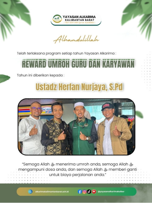 Pemberian Reward Umroh merupakan wujud nyata komitmen Yayasan Alkarima dalam memuliakan para tenaga pendidik dan karyawan yang menjadi pilar penting dalam keberlangsungan pendidikan Islam terpadu. Program ini tidak hanya menjadi bentuk apresiasi, tetapi juga motivasi agar seluruh guru dan karyawan senantiasa meningkatkan kualitas pengabdian dan profesionalisme.
