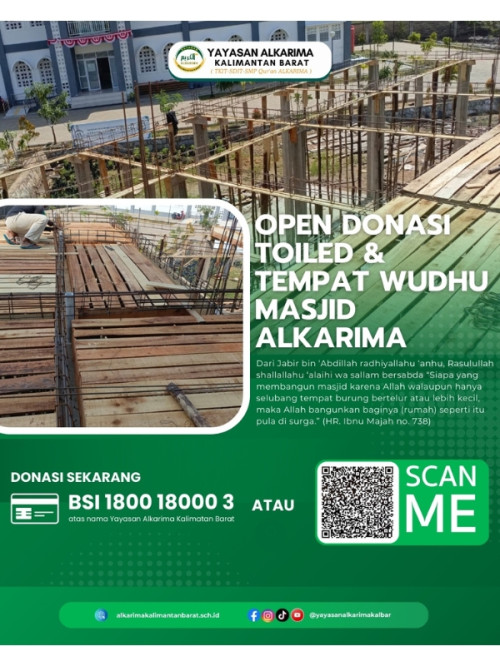 Fasilitas yang memadai di masjid sangat penting untuk mendukung kelancaran ibadah. Karena itu, Yayasan Alkarima mengajak kaum muslimin untuk berpartisipasi dalam program open donasi pembangunan toilet dan tempat wudhu Masjid Alkarima.