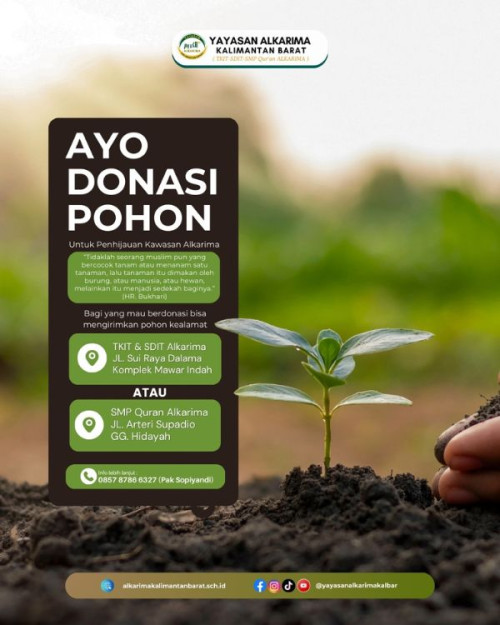 Kubu Raya – Yayasan Alkarima Kalimantan Barat resmi meluncurkan program Donasi Pohon sebagai upaya penghijauan kawasan sekolah dan menciptakan lingkungan belajar yang lebih sejuk, asri, dan ramah lingkungan.