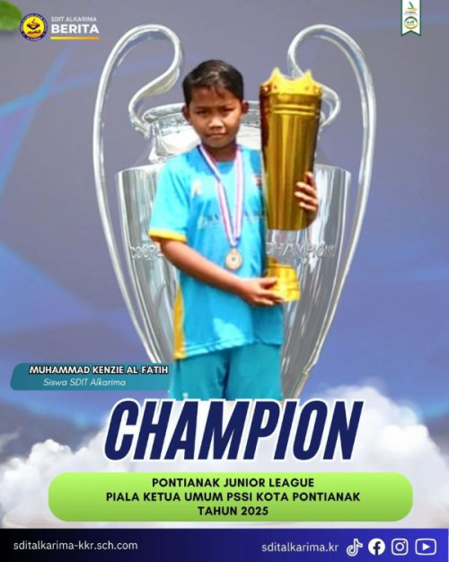 Salah satu siswa SDIT Alkarima Kubu Raya, Muhammad Kenzie Al Fatih, berhasil menorehkan prestasi gemilang dengan meraih Juara 1 Pontianak Junior League Piala Ketua Umum PSSI Kota Pontianak Tahun 2025.