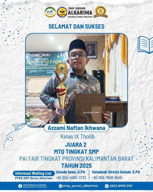 Salah satu siswa terbaik kami, Azzami Naftan Ikhwana dari Kelas IX Tholib, berhasil meraih Juara 2 Musabaqah Tilawatil Quran (MTQ) tingkat SMP pada ajang PAI Fair Tingkat Provinsi Kalimantan Barat Tahun 2025.