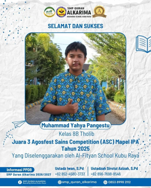Kubu Raya — Prestasi kembali ditorehkan oleh salah satu siswa SMP Quran Alkarima. Muhammad Yahya Pangestu, siswa kelas 8B Tholib, berhasil meraih Juara 3 Agosfest Sains Competition (ASC) Mapel IPA Tahun 2025. Kompetisi bergengsi ini diselenggarakan oleh Al-Fityan School Kubu Raya dan diikuti oleh para peserta dari berbagai sekolah.