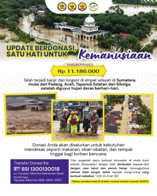 Kalimantan Barat — Yayasan Alkarima kembali mengumumkan perkembangan terkini penggalangan dana untuk membantu korban banjir dan longsor yang melanda beberapa wilayah di Sumatera. Hingga hari ini, total donasi yang terkumpul mencapai Rp 11.186.000.